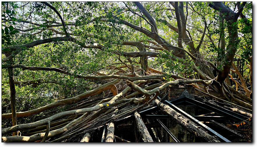 벽이고 천정이고 모두 반얀트리 . 창고벽을 따라 반얀트리 줄기들이 온통 자리를 차지하고 있다.
